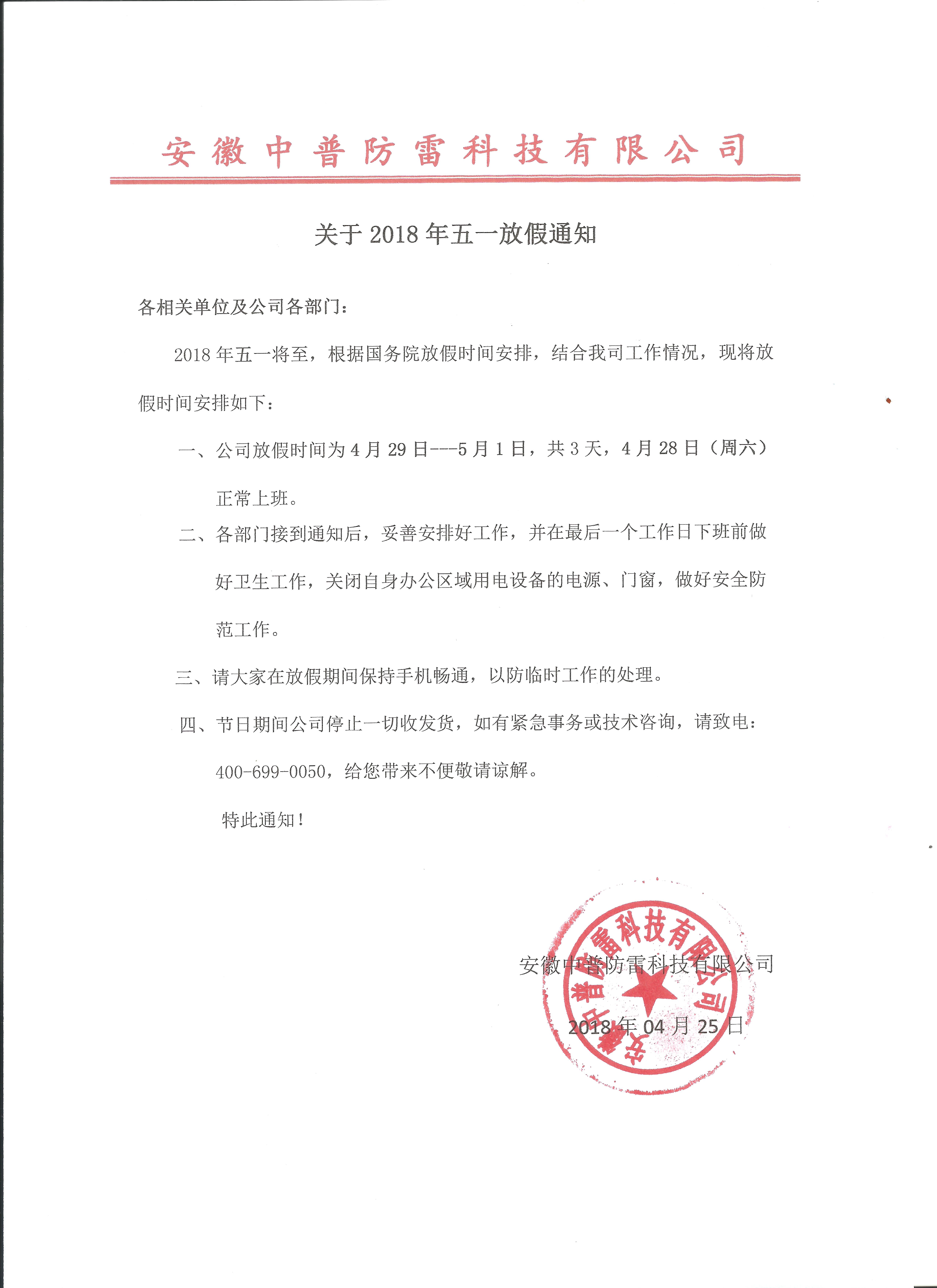 安徽中普防雷“關(guān)于2018年五一放假通知”