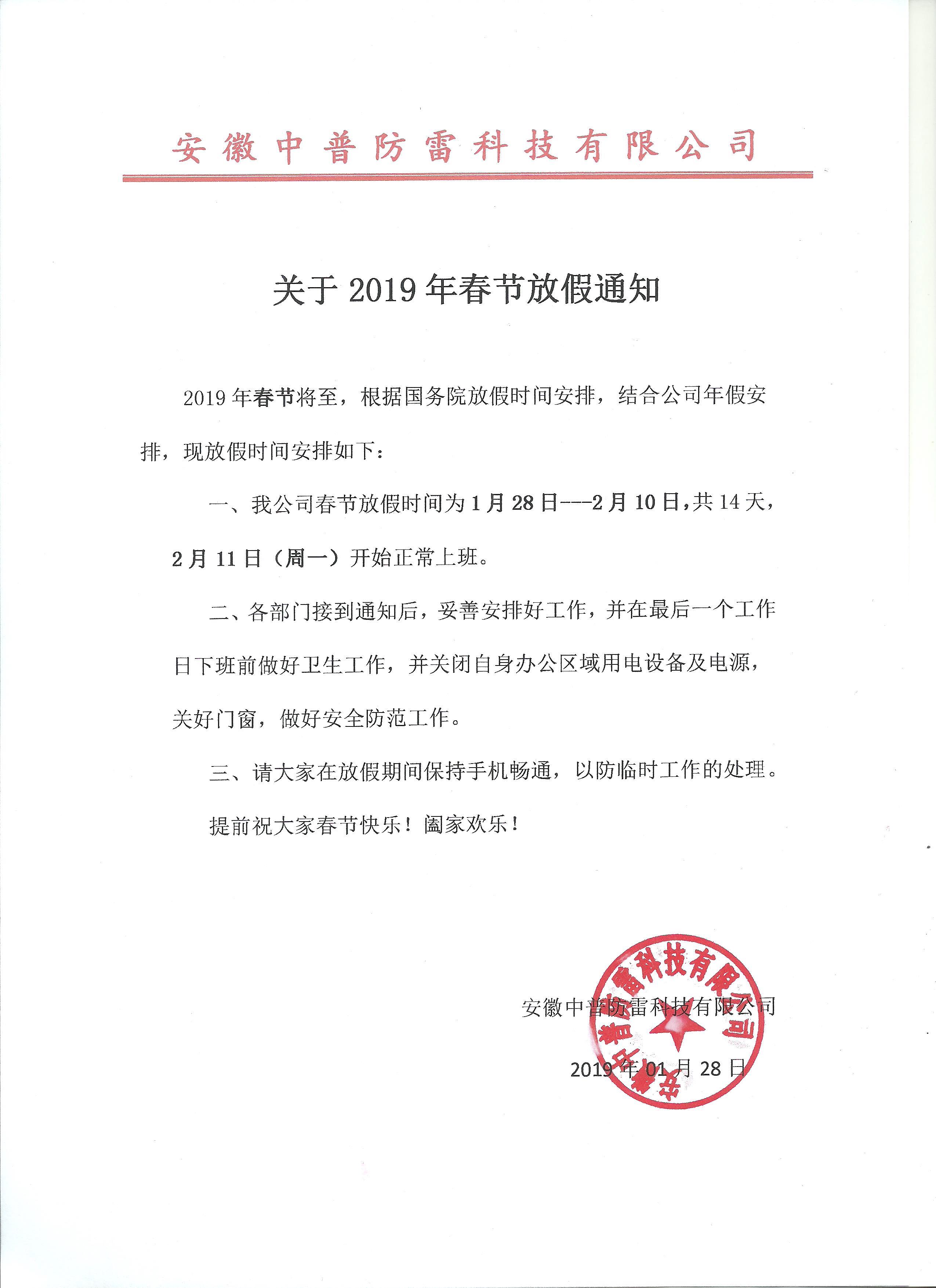 安徽中普防雷“關(guān)于2019年春節(jié)放假通知”