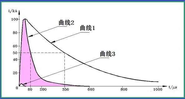 曲線1被稱為沖擊電流Iimp,其波頭時(shí)間為10μS而半峰時(shí)間為350μS 。由于曲線1很接近自然雷電放電的電流波形,常用于一級(jí)配電。曲線3用于二級(jí)和三級(jí)配電的電氣電子系統(tǒng)。