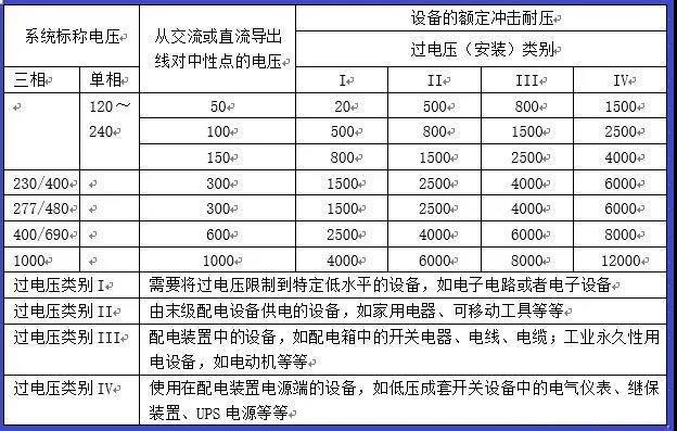 低壓配電網(wǎng)可能遭受的電涌能量形式及數(shù)值大小;電氣設(shè)備承受電涌沖擊的能力;如何實(shí)現(xiàn)讓電涌能量降低到電氣設(shè)備能夠承受的范圍之內(nèi)。低壓配電系統(tǒng)的保護(hù)對(duì)象是低壓配電網(wǎng)中的各類配電設(shè)備和用電設(shè)備。按照國(guó)家標(biāo)準(zhǔn)GB/T16935.1-2008《低壓系統(tǒng)內(nèi)設(shè)備的絕緣配合》,低壓配電系統(tǒng)各類設(shè)備的額定沖擊電壓耐受值見(jiàn)下表: